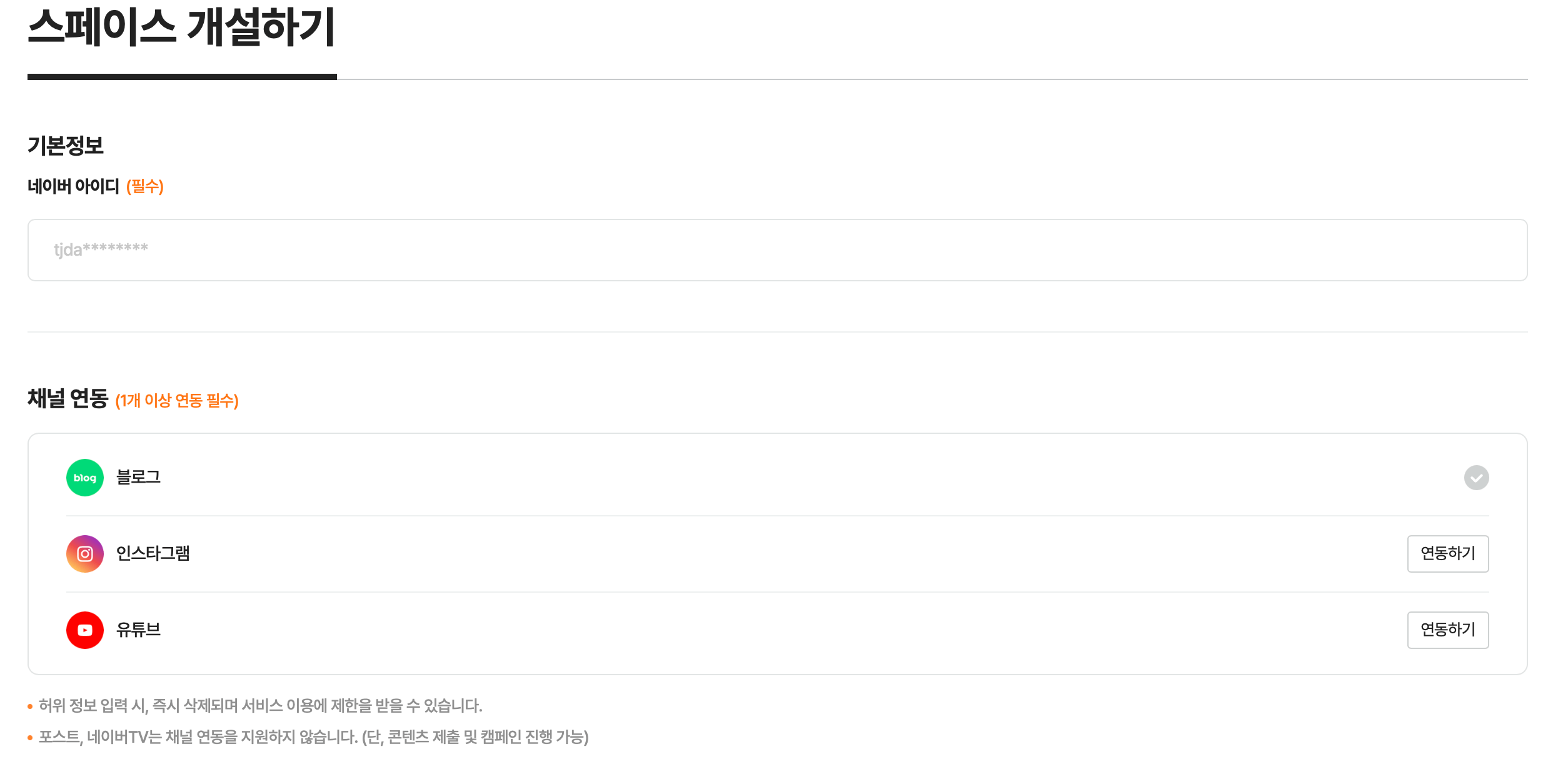 여기서 스페이스명 선택하기는 스페이스명을 만들 수 없고, 자신이 가입해 있는 블로그명이 그대로 스페이스명으로 나옵니다. 그런 후 60일 이후에 변경이 가능하다고 나와있으니 참고하세요.