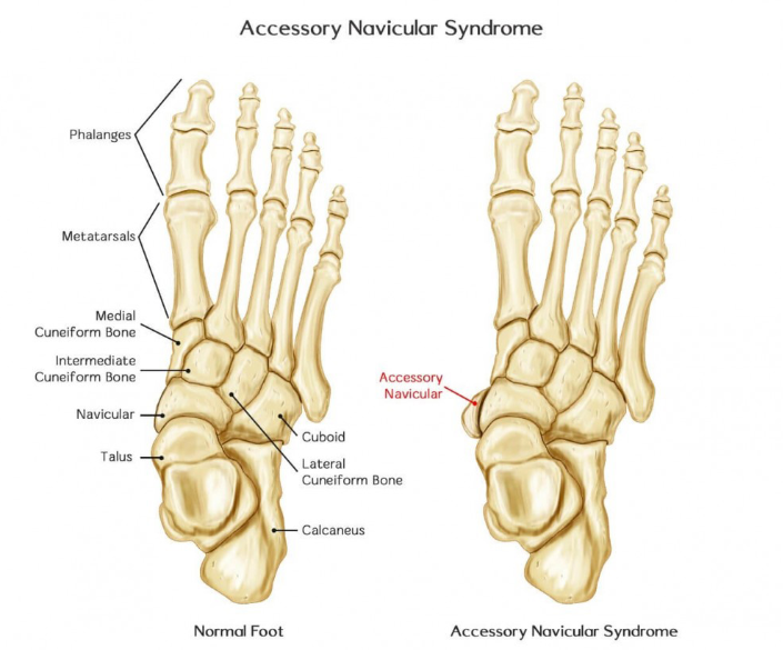 하지만 부속 나비 뼈가 문제가 되는 주된 이유는 통증이 발생할 때입니다. 통증이 없으면 개입할 필요가 없습니다. 부속 나비 뼈는 뼈 돌출부를 형성하기 때문에 내측 아치에서 쉽게 느껴집니다. 보조 뼈가 너무 커서 발등의 이 범프가 신발에 문지르면 통증이 발생할 수 있습니다. 이 고통스러운 상태를 부주상골 증후군이라고 합니다.