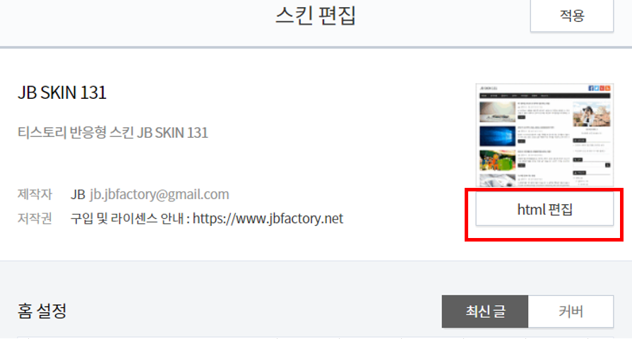 HTML 태그 시커먼 영역을 복사하여 내 티스토리 스킨 편집으로 들어갑니다. 그런 후 HTML편집을 누릅니다.