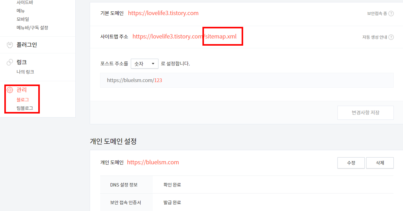그리고 저같이 2차 도메인을 사용하고 있는 분들은 개인 도메인 주소 그대로 해서 앞에 말처럼 sitemap.xml 붙여 넣으면 됩니다. 즉 저 같은 경우 https://bluelsm.com/sitemap.xml이라고 네이버에 사이트맵을 붙여 넣었습니다.