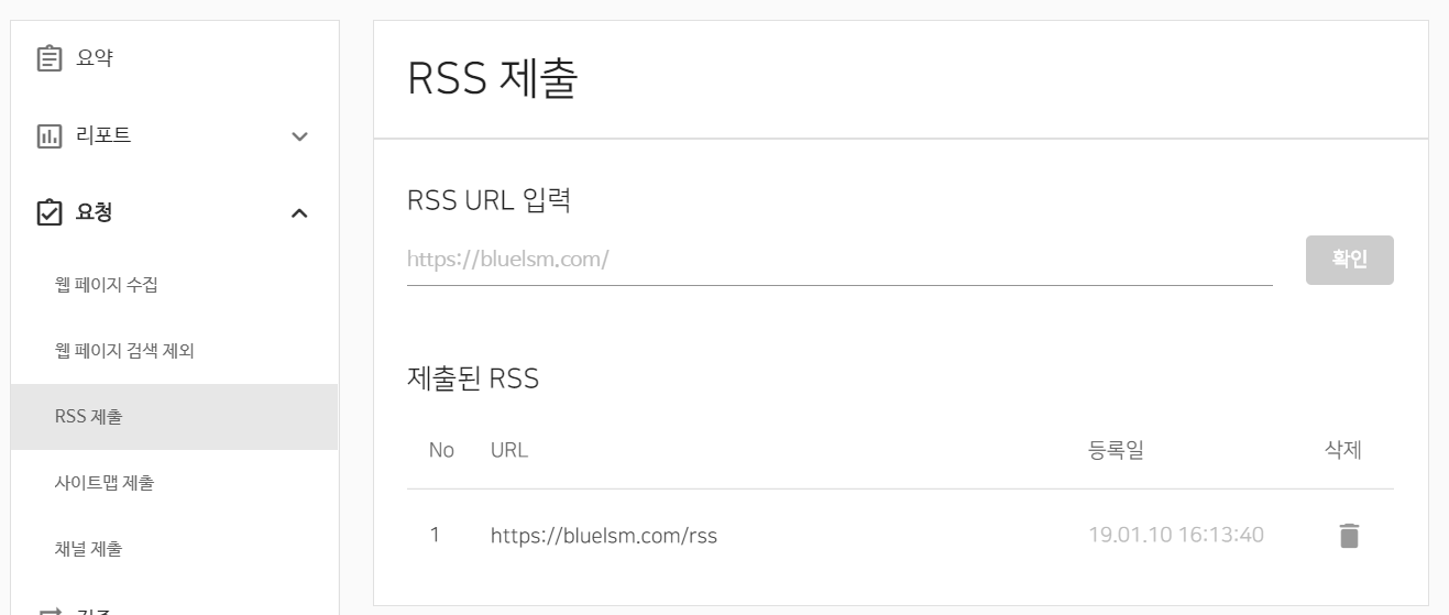 이건 더 간단합니다. RSS제출을 누르시면 똑같이 RSS URL입력란에 그냥 rss만 입력 후 완료를 누르면 아래와 같이 제출이 됩니다. 간단하죠.