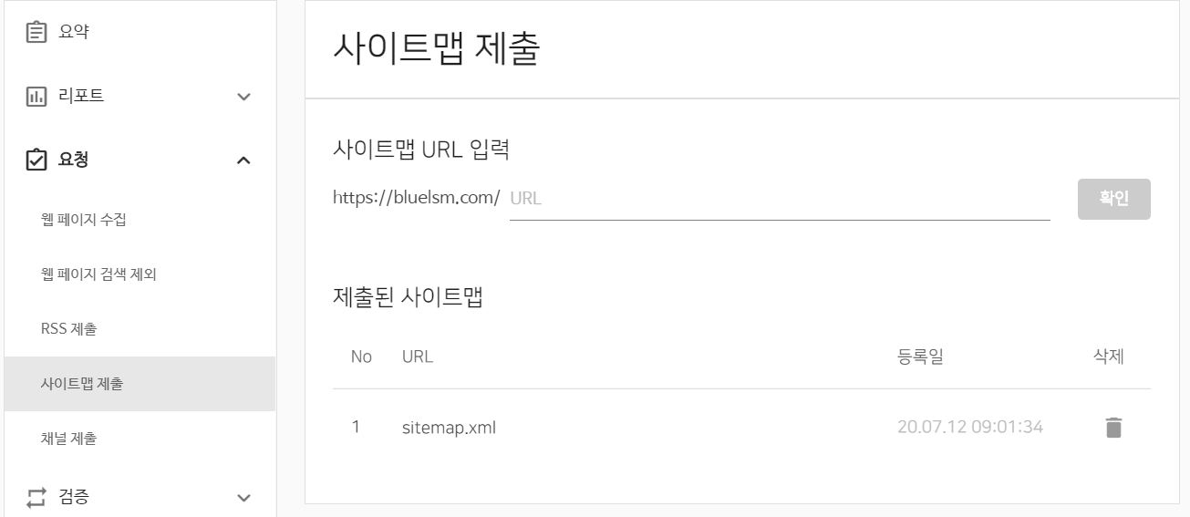 그리고 저같이 2차 도메인을 사용하고 있는 분들은 개인 도메인 주소 그대로 해서 앞에 말처럼 sitemap.xml 붙여 넣으면 됩니다. 즉 저 같은 경우 https://bluelsm.com/sitemap.xml이라고 네이버에 사이트맵을 붙여 넣었습니다.