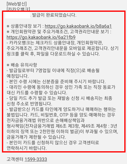 위와 같은 체크카드 재발급 신청 완료라고 나오며, 휴대폰 문자로는 위에서 처럼 발급 완료되었습니다. 이렇게 문자가 옵니다. 발급 완료 후 3-4일 지난 고난 뒤 저는 카카오카드를 바시 받아봤습니다. 어떤가요 카카오카드 재발극 방법 정말 쉽죠. 뭐든 해보면 별거 아닙니다. 이상으로 카카오카드 재발급 방법 초간단 포스팅을 마칩니다.