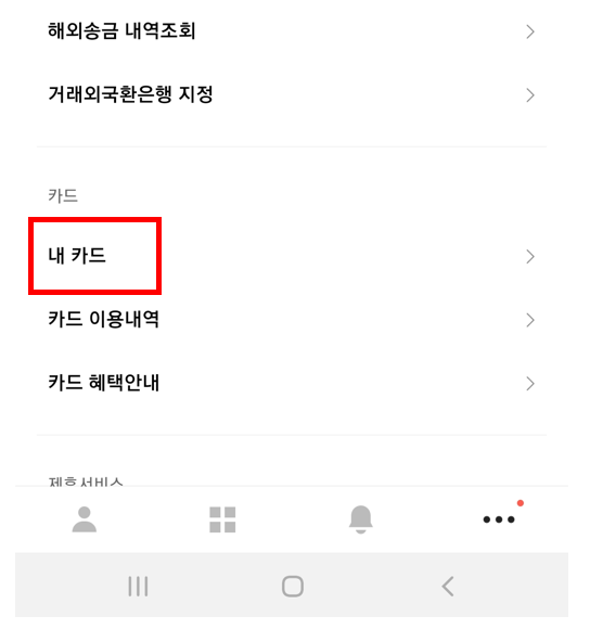 카카오 뱅크에 지문인증 및 번호를 입력 후 들어가면 카드 모양 맨 아래에 보면 저렇게... 이 보입니다. 저것을 클릭해주세요. 그러면 아래와 같은 사진이 나옵니다.