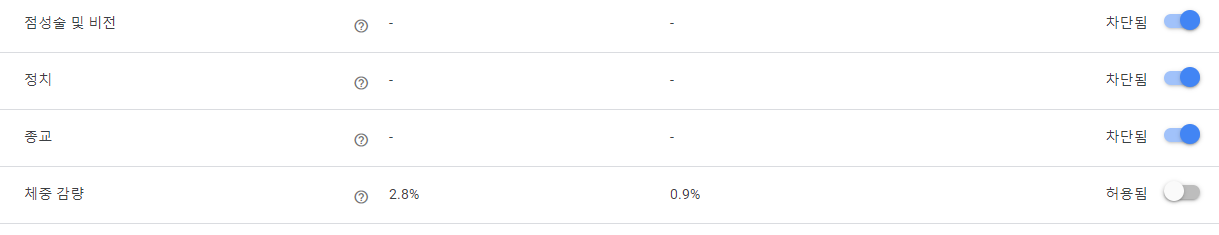 민감한 카테고리 들어가면 광고 노출 비중 / 수익 비중 있습니다. 그것을 참고해서 해도 되고 자신의 블로그와 맞지 않는다고 생각하는 카테고리를 위처럼 차단해줘도 됩니다. 저는 정치, 종교 이런 것들을 차단해 놨네요. 블로그마다 다릅니다. 별 의미 없는 카테고리라면 차단하는 것도 좋을 수 있는데, 그건 스스로 자신의 블로그에 실험해 봐야 합니다.