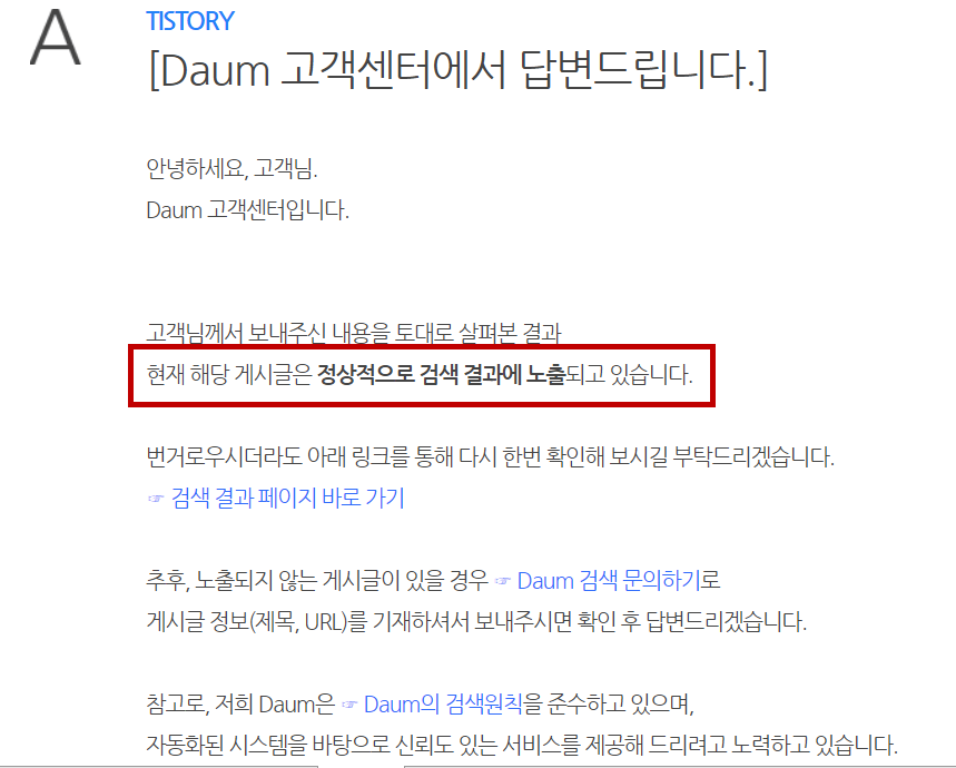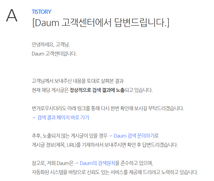 다른 블로그들은 잘만 다음에 나오는데 유독 처음에 무엇을 잘못했는지 알수가 없기 없네요. 그래서 다시 한번 독기를 품고 다음 고개센터에 요청을 했습니다. 내 글이 다음에 검색이 안된다. 그렇게 넣으면 오는 답변은 아래와 같습니다.