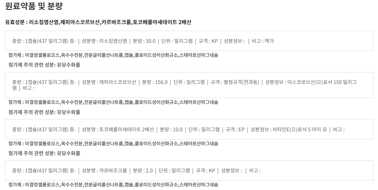 - 기타 첨가제 : 옥수수 전분, 전분 글리콜산 나트륨, 캡슐, 콜로이드성 이산화규소, 스테아르산 마그네슘, 미결정 셀룰로오스