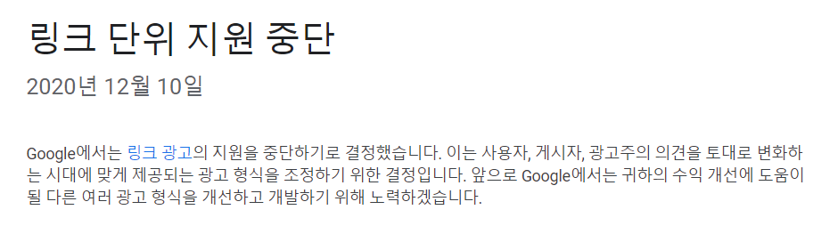 우려하던 일이 생겼네요. 애드센스 수익에서 상단부분 차지하고 있던 링크 단위 광고 지원을 중단 한다고 합니다. 신규 애드센스 가입자들은 만들수 없었던 광고인데요, 기존 링크광고를 사용하던 모든 사람들까지 2021년 3월 10일 이후 만들수 없다고 합니다. 자세한 내용 아래 참고하세요.