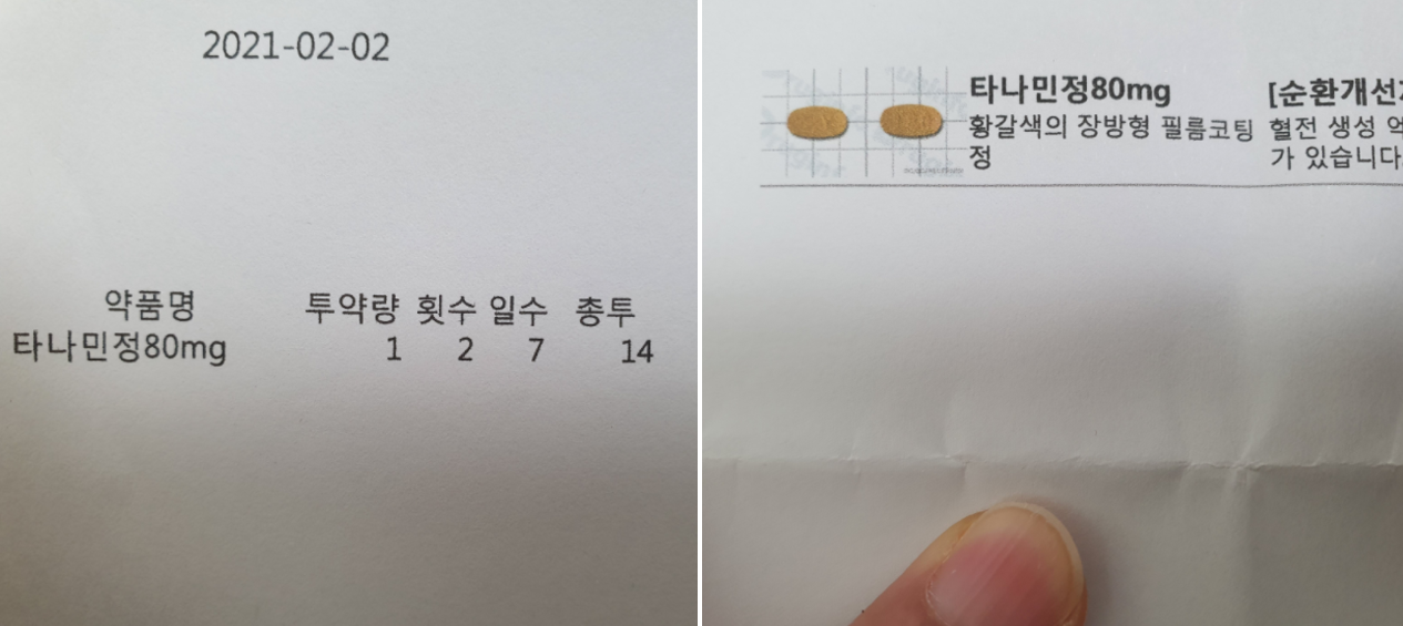 여기저기 알아보니 약국에 기존 타나민정80mg은 대략 60정기준 1만5천원이면 구입 가능하고, 타나민정 40mg 90정은 1만 4천원정도 하던데, 왠지 처방전 받고 더 비싼 비용을 치룬거 같네요.