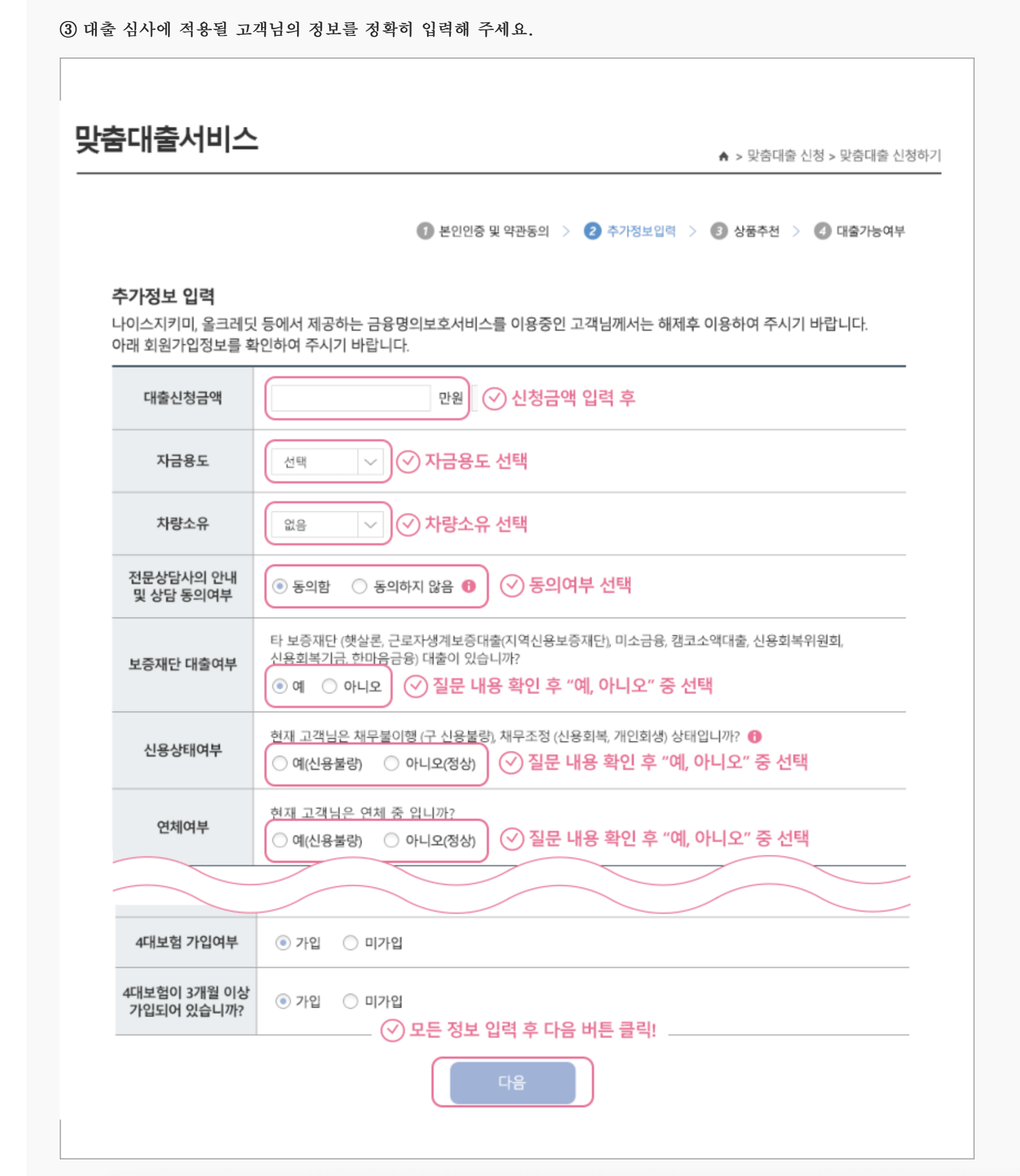 위와 같은 단계로 이루어지니, 여기저기 알아볼 필요가 없습니다, 현재 돈이 필요한 분의 상황에 맞게 맞춤으로 알려주고 있기 때문에, 일단 여기서 자신이 어느 정도 금리로 빌릴 수 있는지 그정도는 알아보고 다른곳에서 더 싸게 빌릴수 있는지 확인하세요.
