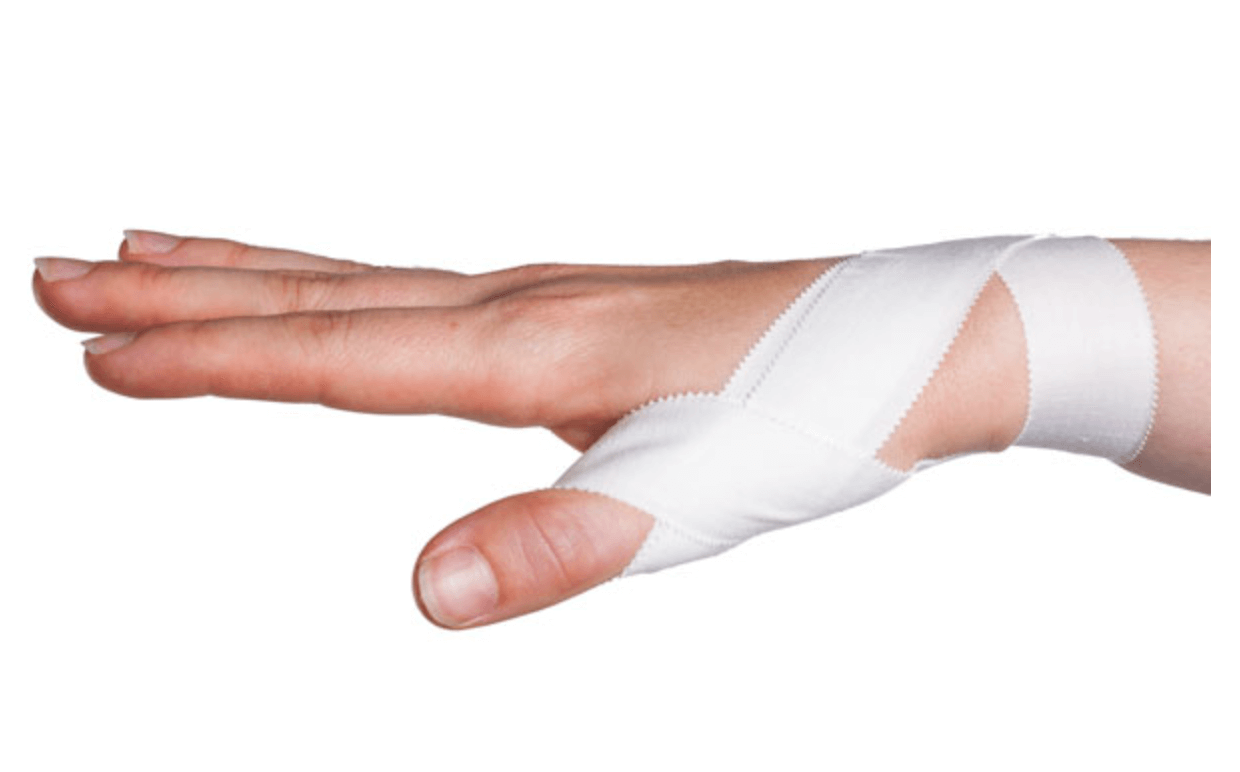 그런후 손목의 바깥쪽 가장자리 부터 시작하여 대각선으로 엄지손가락의 첫번째 관절로가 한번 돌립니다. 테이프가 스스로 교차하도록 엄지손가락 전체를 계속해서 지나간 다음 손바닥 바닥과 손목 바깥 쪽으로 내려와 테이프가 시작된곳에서 끝이 납니다 아래 사진 참고
