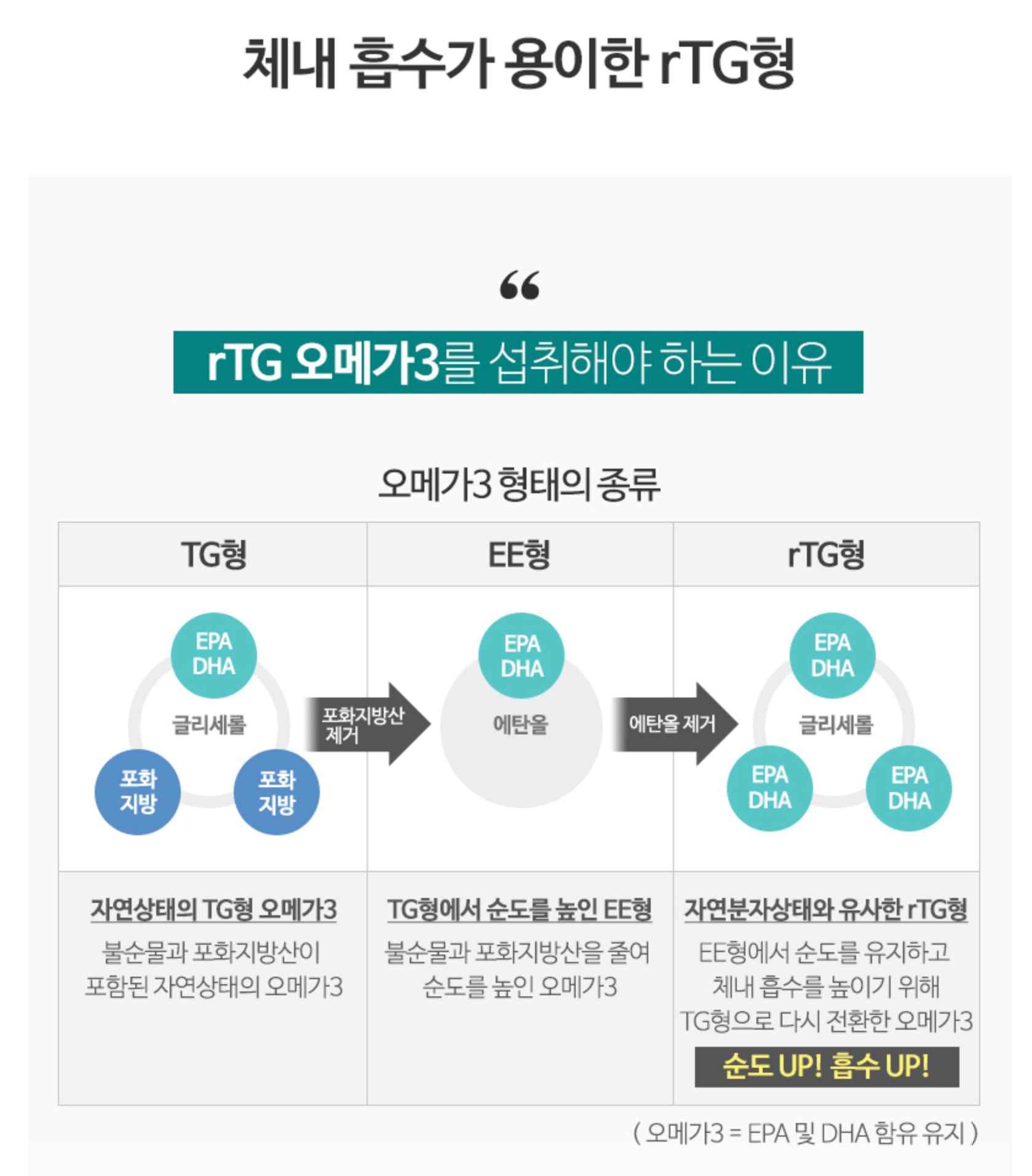 또한 오메가3 분자구조에 따라 TG, EE, RTG형으로 나눌수 있으며, 여기서 RTG가 함량과 흡수율이 가장 높기 떄문에 오메가3는 무조건 RTG로 선택하는것이 좋습니다.