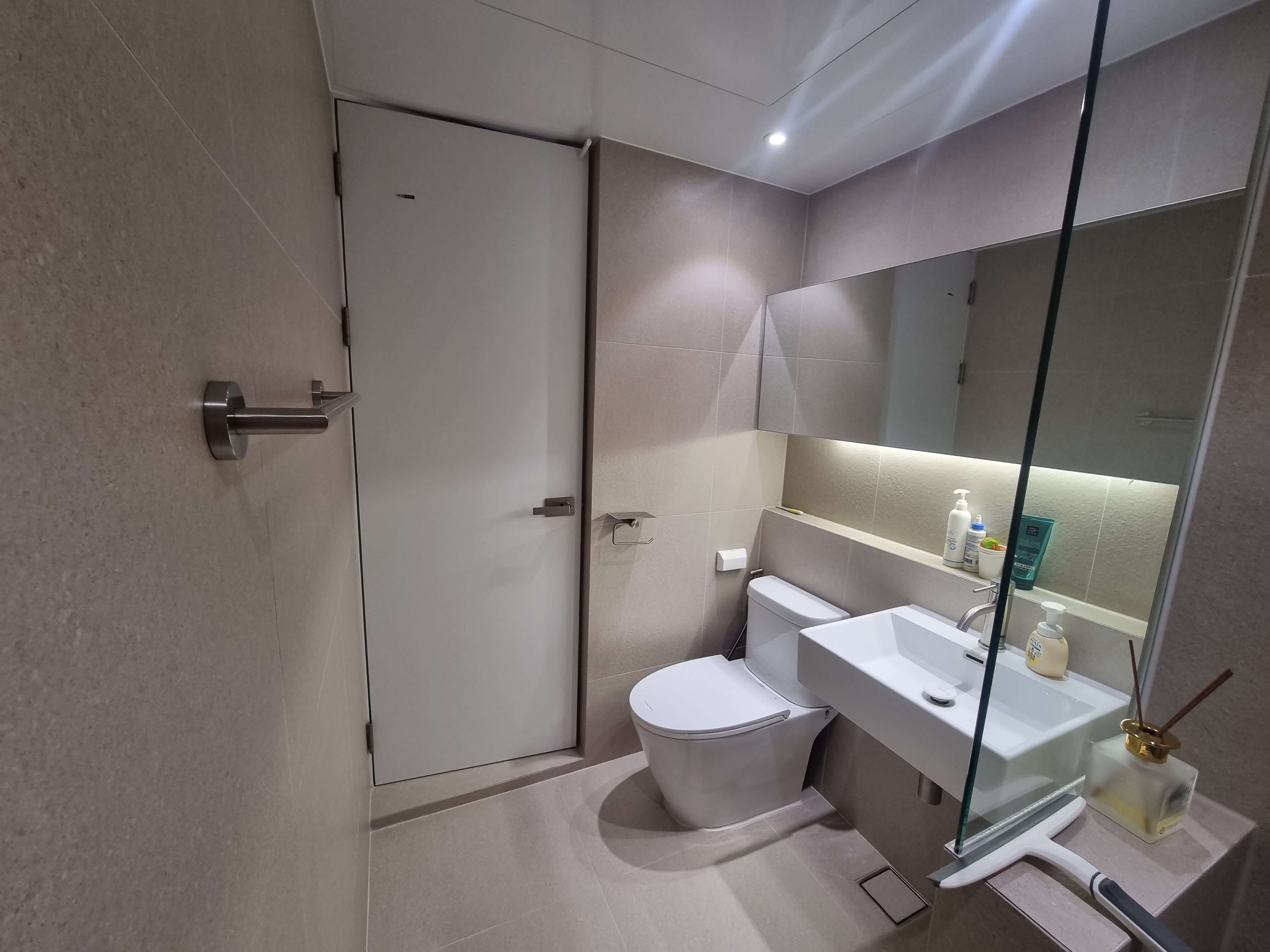 거실 화장실과 비슷해 보이지만 타일 색상이 조금 다르고, 젠다이를 끝까지 줘서 따로 샤워부스에 샴푸나 면도기 나두는곳을 설치할 필요가 없이 편하게 사용할수 있습니다.